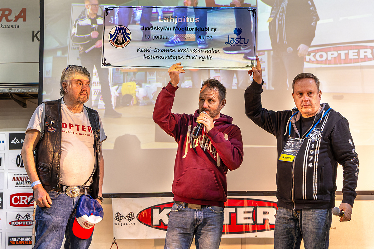 Päätöspäivänä JMK ry lahjoitti pääsylipputuloista K-S Keskussairaalan lastenosastojen tuki ry:lle eli Lastulle. Vastaanottajana Lastu ry:stä Turkka Saarikoski ja luovuttajana Jari Kielinen ja Timo Mononen JMK ry:tä.